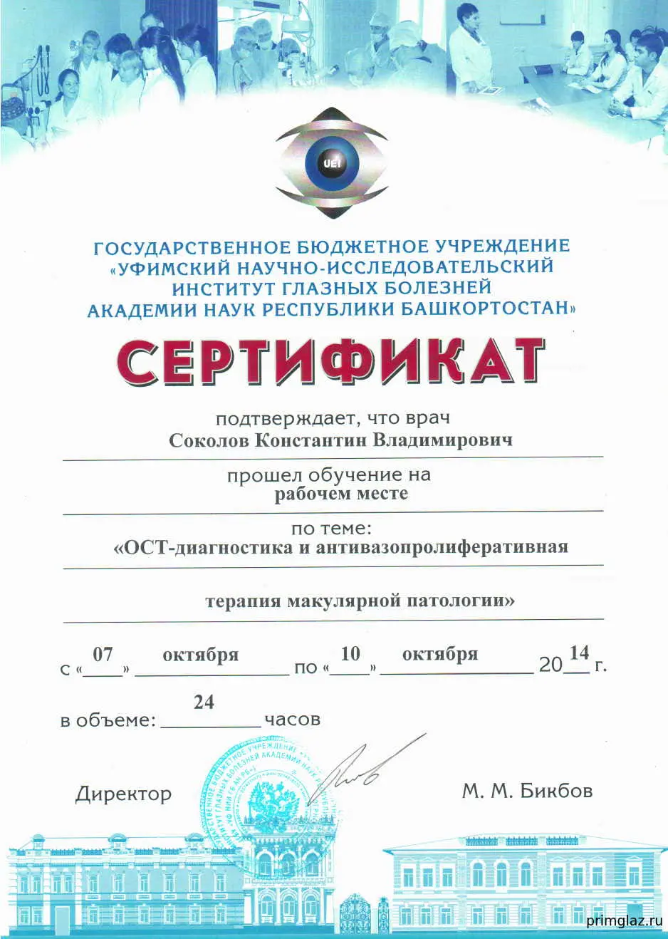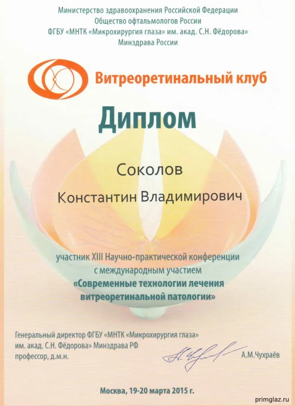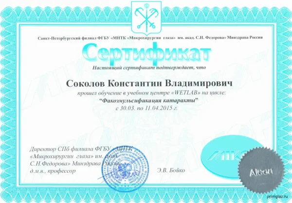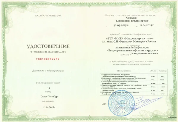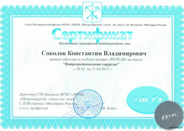 2005 г. – ТУ «Микрохирургия глаза и имплантация ИОЛ» в ГУ МНТК «Микрохирургия глаза» им. С.Н. Федорова, г. Москва.