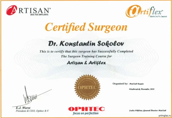2009 г. – ТУ «Аподизированная дифракционная асферичная ИОЛ Restor asferic», г. Владивосток.